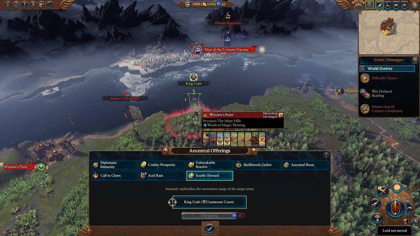 Очистить планетуВ игровом сценарии я принял роль Короля Краба, который якобы захватил корону и скипетр Грегаса Голдтуффа. Было бы нечестно отрицать, что они отлично ему подошли. Ваше путешествие начинается на восточном побережье Империи в разгар войны с маркграфом Мариенбурга по имени ‘Симон Охотник на Крабов’ и некоторыми норсканцами. Отличительной чертой этой кампании является ресурс, называемый Блестящими Раковинами, которые могут быть использованы для выполнения приказов, аналогичных приказам Карла Франца, таких как расширение зоны передвижения армии (‘ползком вперед’), получение иммунитета к штрафам за вторжение и другие цели. К тому же вы начинаете с двумя подразделениями рыцарей-крабов, по сути большими крабами, несущими меньших.