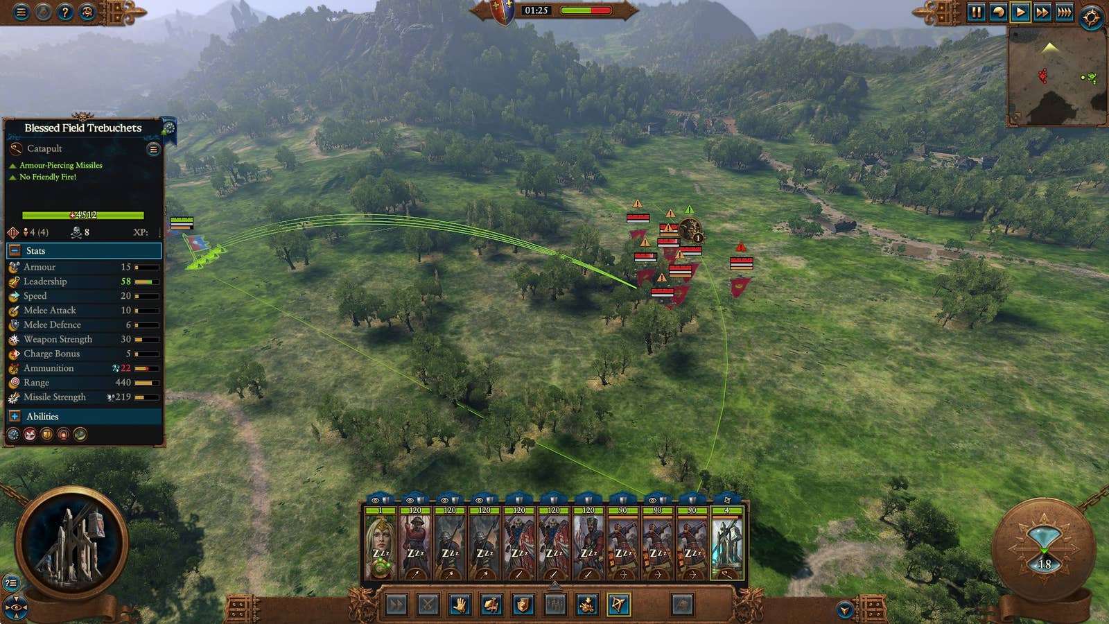 В этой тактической стычке гоблины сначала выставляют свои самые мощные пушки в качестве разминки для противостояния нашей недавно побежденной кавалерии. Однако наш превосходящий требушет превосходит их по дальности на 40 метров и не причиняет вреда нашим собственным войскам. Я решаю использовать стратегию ‘Битвы за Винтерфелл’, размещая мой требушет (по-французски это означает ‘большая бадья’) впереди линии, чтобы защитить солдат от вражеского артиллерийского огня. Одновременно я посылаю группу копейщиков медленно через лес, чтобы справиться с пушками. Безусловно, мы понесем некоторые потери, но благодаря целительным способностям фей и нашей возможности блокировать поставку боеприпасов к их пушкам, потери не будут катастрофическими. Возможно произойдет артиллерийская дуэль, однако мне нужно сначала ослабить вражескую пехоту требушетом, так как наша собственная весьма недостаточна.
