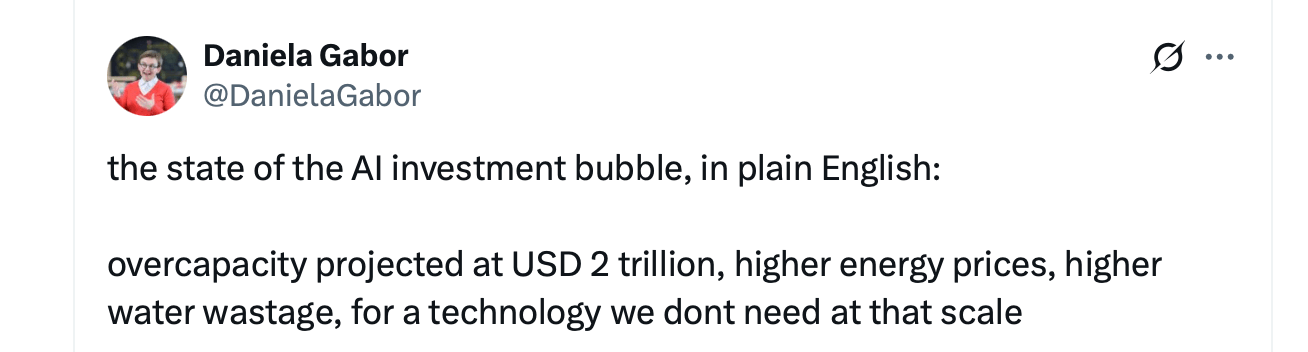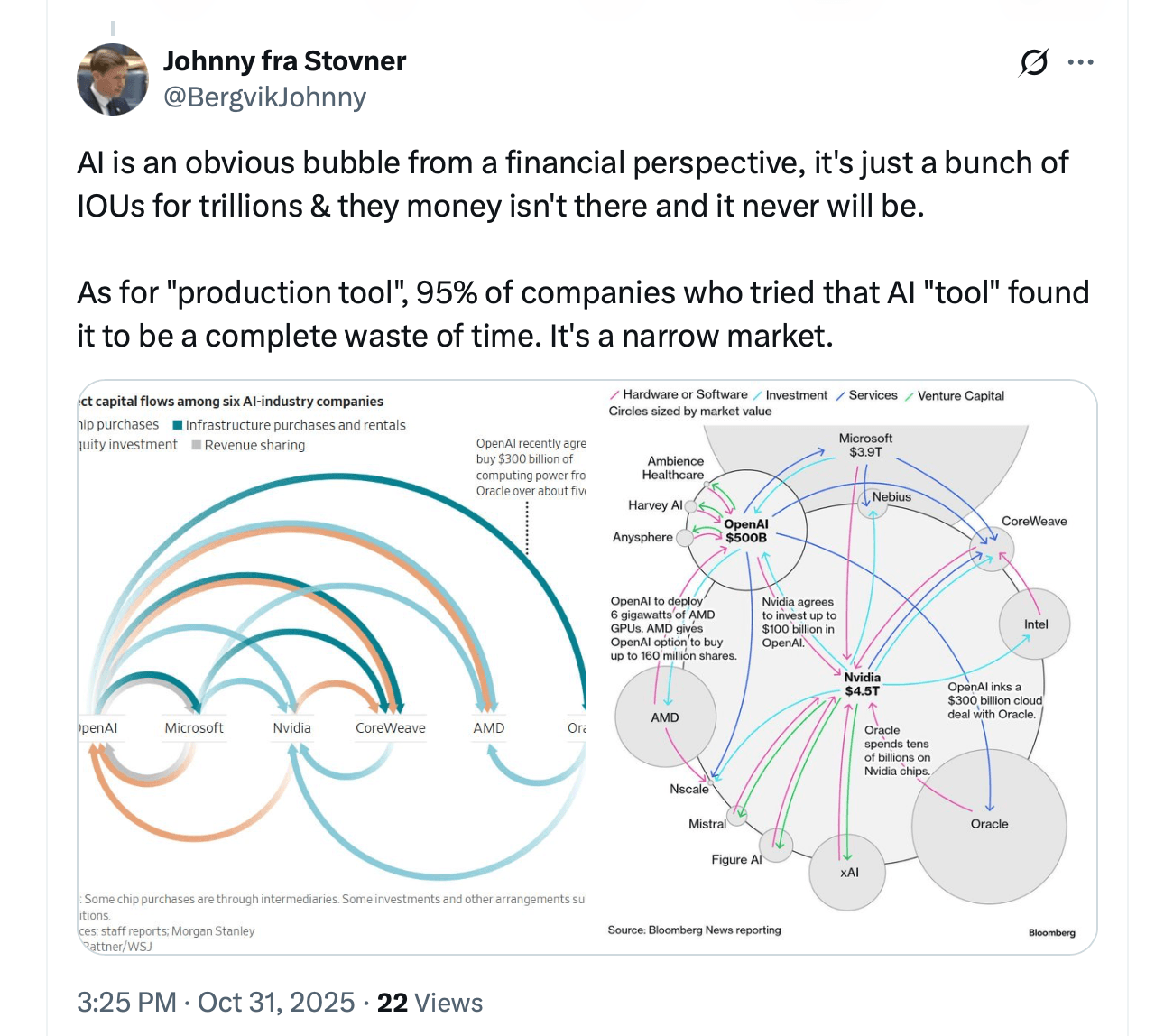 Аналитики называют переизбыток мощностей, слабую доходность инвестиций и круговое финансирование между компаниями, занимающимися искусственным интеллектом, явными тревожными сигналами. Тревожные сигналы, действительно. ⚠️ - Может ли ИИ остаться долгосрочным победителем?