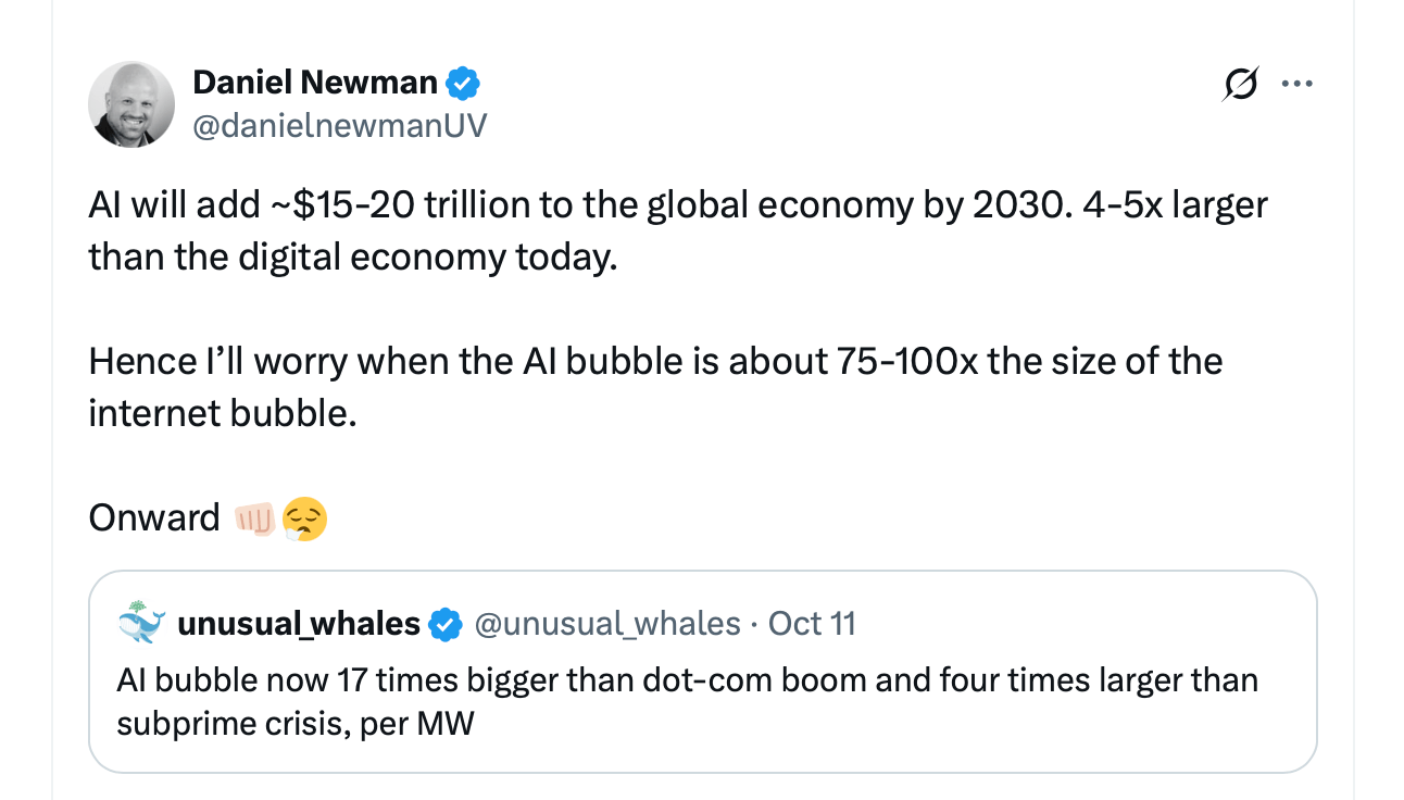 Оптимисты, такие как Daniel Newman, не видят пузыря, прогнозируя, что ИИ может добавить до $20 триллионов к мировому ВВП к 2030 году. Напряженность между долгосрочными перспективами и краткосрочными спекуляциями делает этот момент таким шатким. Критики утверждают, что рынки наконец-то адаптируются к реальности. С 95% корпоративных ИИ-проектов, не приносящих прибыли, компании замораживают экспериментальные бюджеты и сокращают планы по развитию инфраструктуры. Проверка реальности, возможно? 🧠